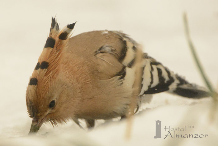Hoy ha amanecido nevando y aparte de los habituales de cada día como ZORROS, CARBONEROS, HERRERILLOS… nos han visitado un macho de CURRUCA CAPIROTADA, una hembra de PINZÓN REAL que no sé qué hace aquí todavía, debía haber emigrado ya, un MILANO REAL que aprovechó para sacudirse todas las plumas, el inquieto y diminuto MITO con su larga cola, los primeros ARRENDAJOS de a temporada, la increíble pareja de CUERVOS que cada día escenifica la película de Hitchcock en el cristal y una pareja de ABUBILLAS buscando gusanos bajo la nieve.